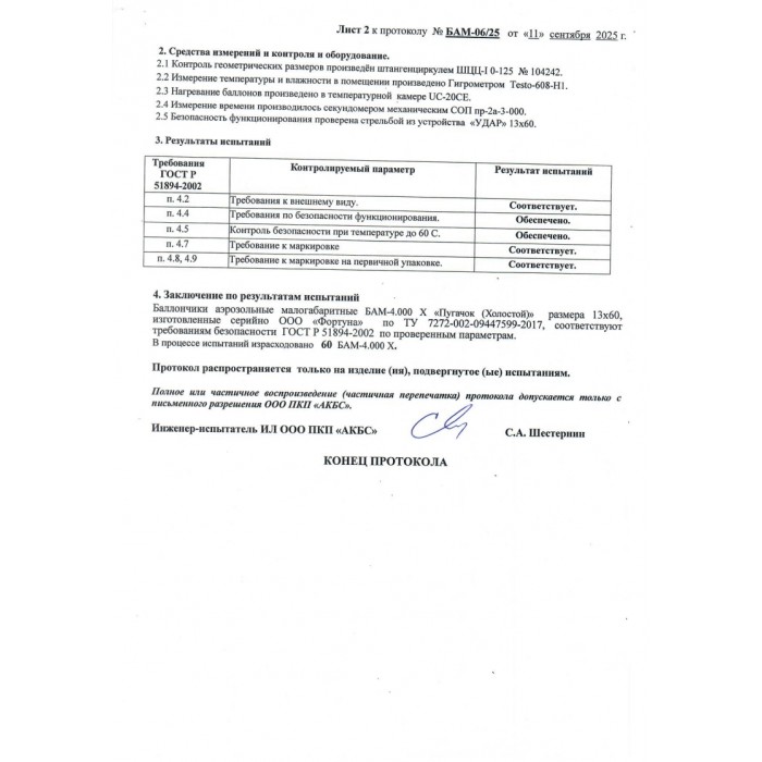 Баллончик аэрозольный малогабаритный «Пугачок» предназначен для стрельбы с целью создания шумового эффекта, имитирующего настоящий выстрел, образуя пороховые газы. Внешне баллончик представляет собой металлическую гильзу.