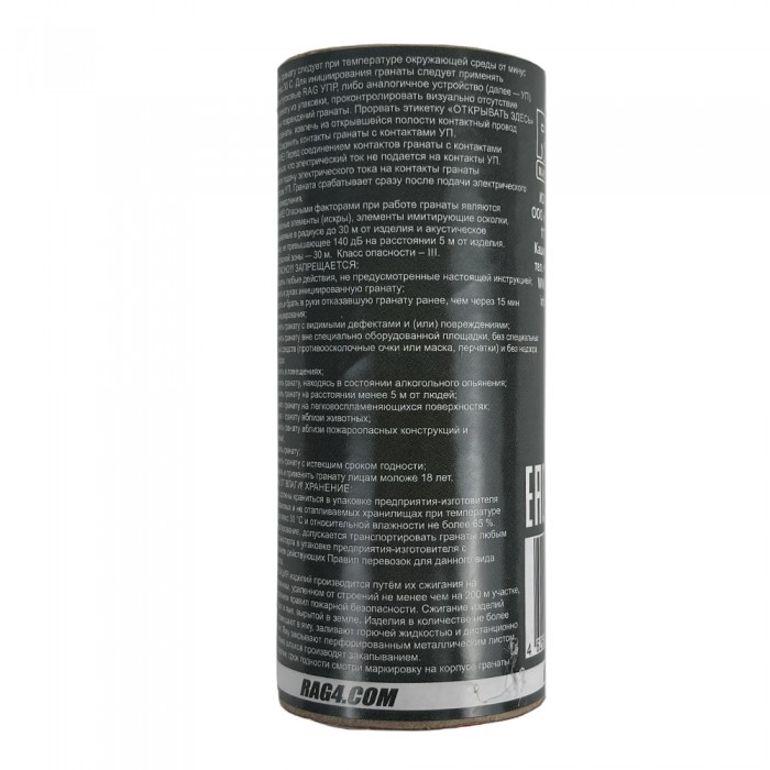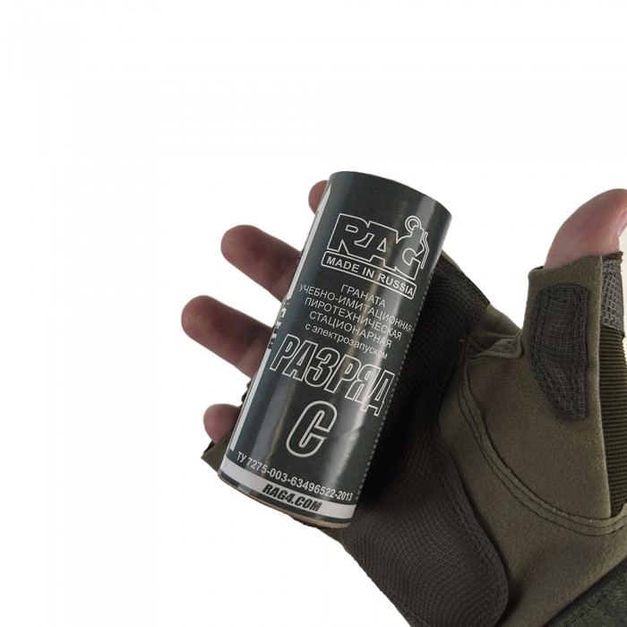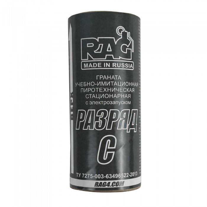 Учебно-имитационная пиротехническая граната стационарного размещения RAG РАЗРЯД-С, компактное учебно-имитационное средство для использования в качестве мины с электрическим запуском, предназначено для использования преимущественно при проведении военно-спортивных игр СТРАЙКБОЛ. Для имитации подрыва управляемой мины, изделие срабатывает с громким хлопком и разлётом наполнителя в виде гороха формируя условно-осколочный эффект. Запуск изделия производится специальным устройством пусковым (УП) которое подаёт электрический ток на контактную группу изделия, после чего изделие срабатывает без задержки.