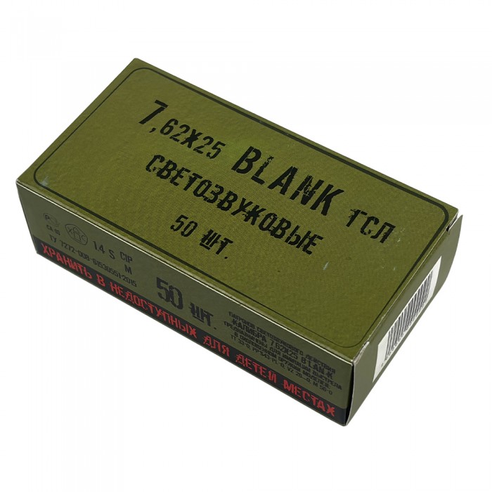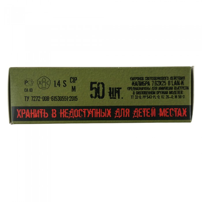 Патроны светозвуковые (шумовые) калибра 7,62x25 предназначены для имитации выстрела из списанного (охолощенного) оружия ТТ 33-О, PPs43 PL-O, VZ 26-O. По 50 штук в упаковке. Патрон травмобезопасен, стрельба с помощью них громкая и эффектная.