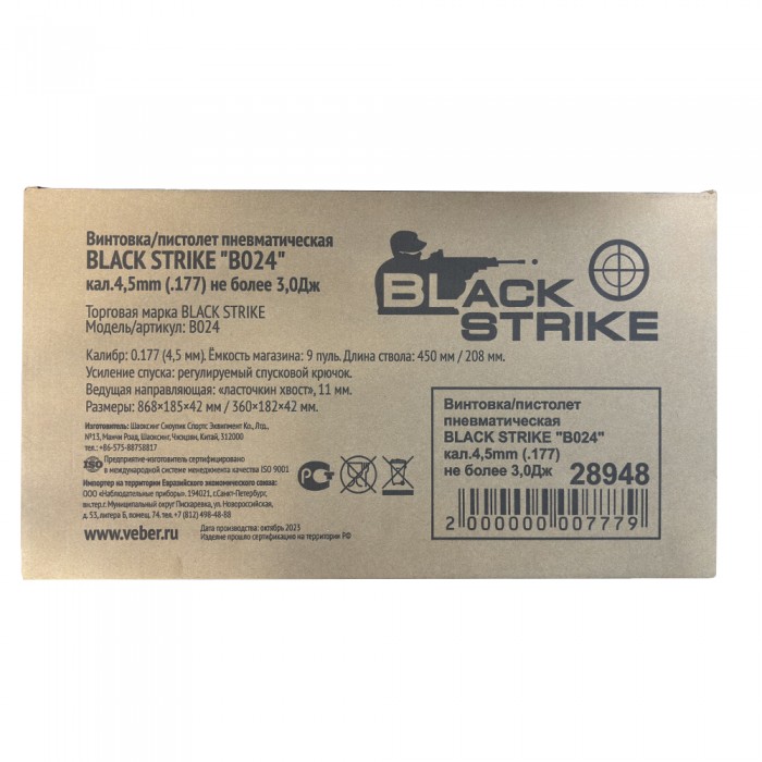 Пневматический PCP пистолет-винтовка Strike One B024 Black. Максимальное давление 150 Атм. Заправочный штуцер в комплекте.