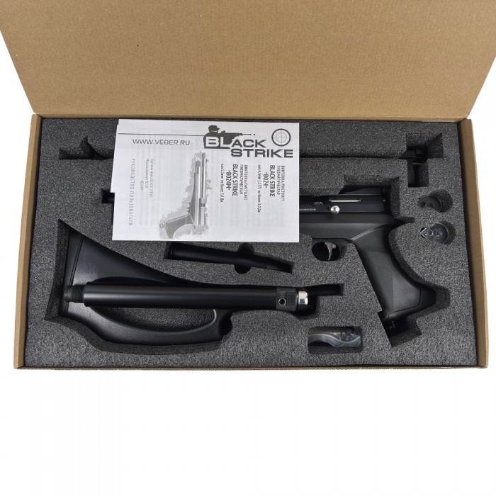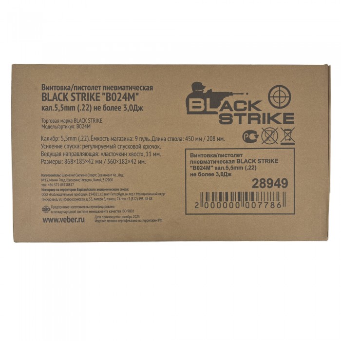 BLACK STRIKE "B024M" – пневматическое устройство с резервуаром собственного производства «Нева-Таргет». Устройство может использоваться как пистолет, так и как винтовка. Калибр 5,5 мм (.22) обеспечивает большую дальность и лучшую кучность стрельбы.