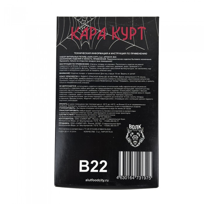 Петарды "Каракурт" от бренда Волк — это одни из самых мощных петард, доступных на рынке. Каждая петарда содержит 30 грамм флэш-пороха, обеспечивая сверхгромкий звуковой эффект. Упаковка по 3 штуки идеально подходит для тех, кто хочет купить петарды для значимого мероприятия или добавить силы к праздничному фейерверку.