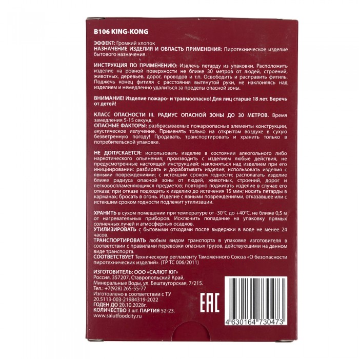 Петарды King-Kong B106 - мега мощные петарды уровня Корсар-18 и даже выше. В упаковке 3 большие петарды. Мега-громкий хлопок и неудержимая мощь этих петард превосходит все ожидания, без преувеличения.