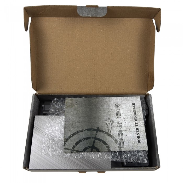 Обозреваемая модель Борнер работает от СО2 баллончиков емкостью 12 грамм - распространенность указанного источника питания сделала эксплуатацию модели комфортнее. Баллон вставляется через окно, закрытое щечкой рукояти. Для установки потребуется снять ее и выкрутить винт поджима до упора вниз, после чего разместить емкость в выделенном под это месте и закрутить пробку до прокола с помощью шестигранного ключа.