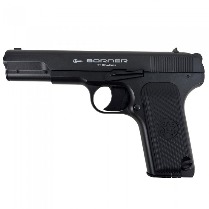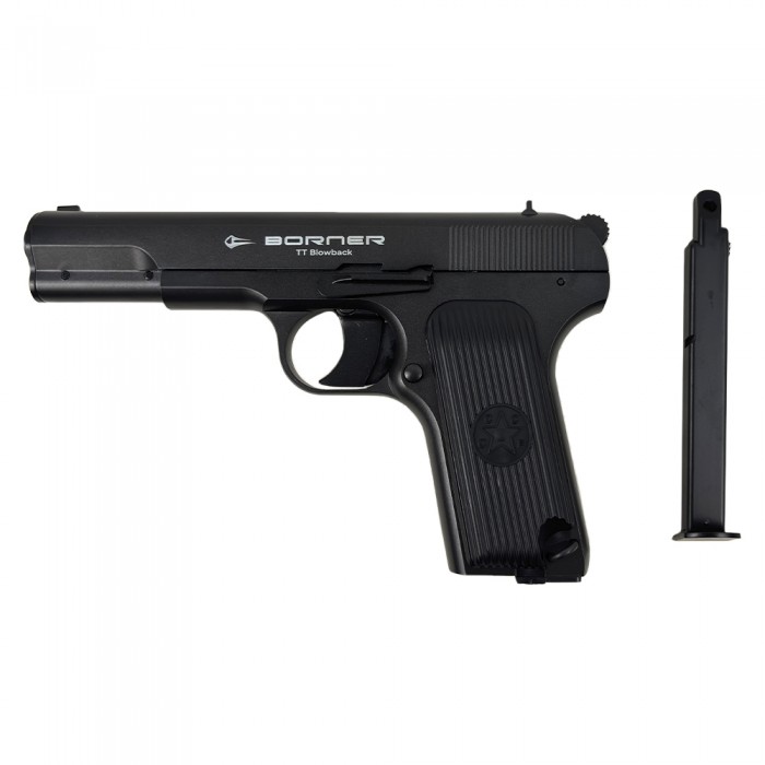 Пистолет ТТ пневматический металлический Борнер работает в полуавтоматическом режиме - иными словами стрелку не потребуется взводить его каждый раз перед выстрелом, следует просто нажать на спусковой крючок. В магазин изделия входит до 18 шариков - накопитель фиксируется в рукояти с помощью кнопки, которую можно отыскать рядом со спусковой скобой.