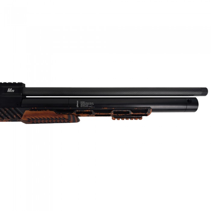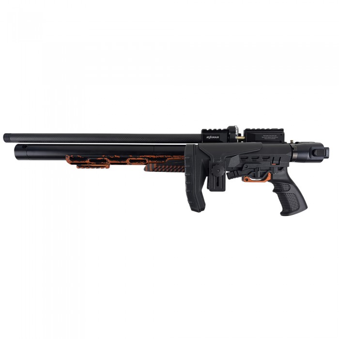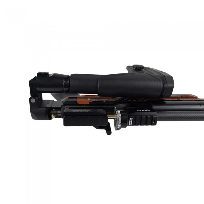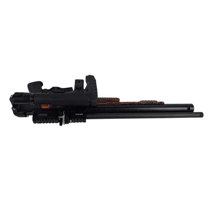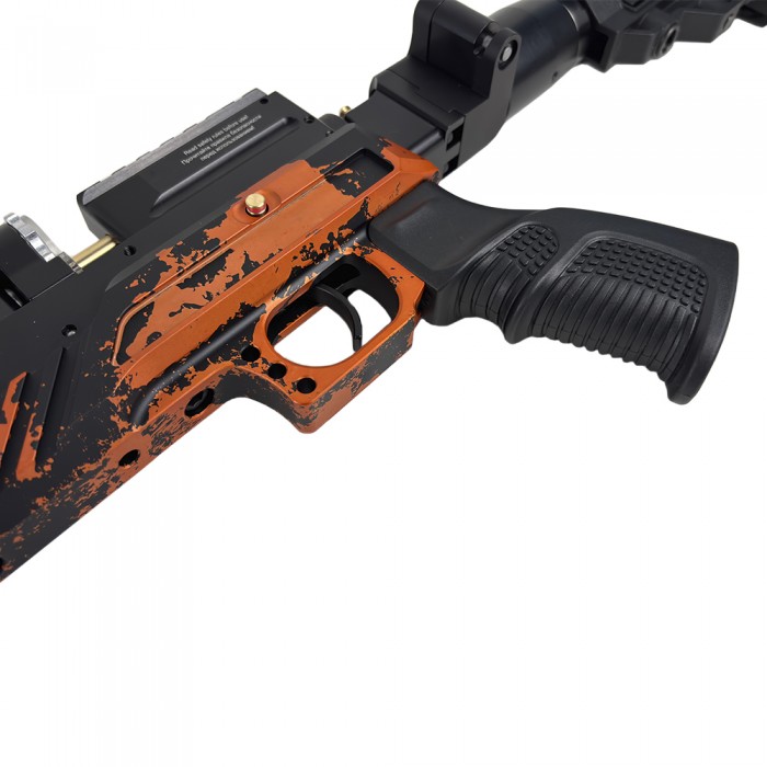 Изделие нуждается в предварительной заправке воздухом, который нагнетается под давлением до 300 Бар в подствольный резервуар линейного типа. Объем последнего составляет 160 кубических сантиметров, причем система по умолчанию включает редуктор. Указанный модуль расширяет простор настройки пневматики, делая ее эксплуатацию более предсказуемой.